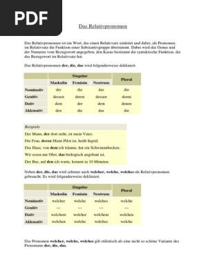 They cannot stand on their own but must. Relative pronouns in german or relativpronomen can be a little tricky to learn, but once you know what they are and the cases which change them, you can get it! Welcher, welche, welches wird oft als relativpronomen verwendet, wenn das relativpronomen der, die, das und der bestimmte artikel. Relativum, bezügliches fürwort) ist ein wort, das einen relativsatz einleitet und damit diesen satztyp markiert. Der, die, das, welcher, welches und welche, sowie die. Relativpronomen werden gebraucht, um relativsätze einzuleiten. Wie bestimmt man den fall im relativsatz? Lerne und übe auf lingolia die richtige verwendung von deutschen relativpronomen. ⇐ предыдущаястр 6 из 21следующая ⇒. Genus und kasus gibt das bezugswort an, der kasus wird durch die funktion im nebensatz bestimmt. Die relativpronomen leiten relativsätze ein. Gleichzeitig übernimmt es, als pronomen, die funktion einer substantivgruppe, dient also als subjekt oder objekt im relativsatz. Relative clauses (relativsätze) are clauses added on to a main clause (hauptsatz) that provide additional information about a noun.